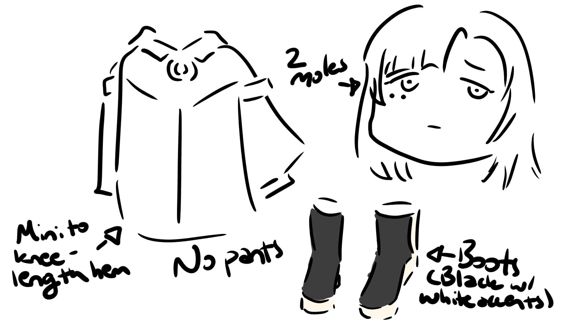 *I was curious about Nanase and Kairi's outfits in their full glory, and they sent me a full-body picture of Nanase which happened to be from the first time they drew Nanase, and is also the only full-body picture of her (and I'm assuming the outfit). Since I'm not sure if I'm allowed to post the picture, I've chosen to just recreate the key points of the picture, which they talked about one of them more right below.*